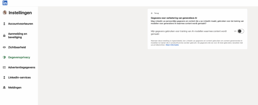 Maak je niet tijdig bezwaar dan zal LinkedIn automatisch gebruikmaken van jouw openbare content en persoonsgegevens (geen privéberichten) voor AI-training.